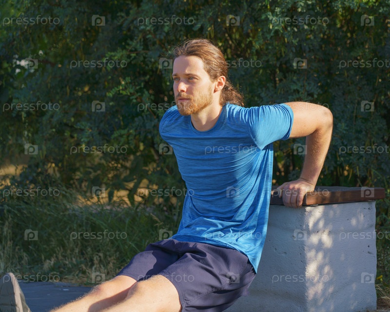 Сосредоточенный молодой спортивный мужчина в спортивной одежде тренирует трицепсы, отжимаясь на скамейке в парке в летний день, наслаждаясь уличными тренировками. Здоровый активный парень делает упражнения для сильных рук на открытом воздухе