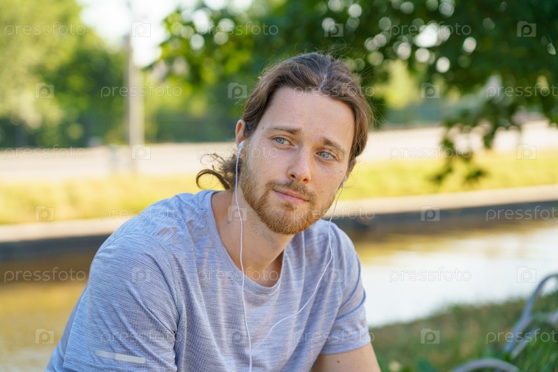 Портрет молодого задумчивого спортивного мужчины в наушниках, слушающего музыку во время отдыха после тренировки на свежем воздухе или спортивных тренировок, вдумчивый спортсмен-мужчина смотрит в сторону, делает перерыв после пробежки в парке