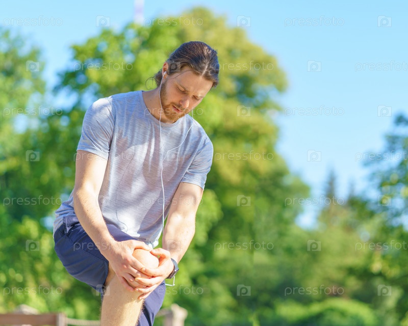 Профессиональная травма. Несчастный спортивный молодой человек в спортивной одежде, страдающий от боли в колене или мышечной травмы во время тренировки в парке, обеспокоенный спортсмен-мужчина в наушниках, держащий ногу обеими руками
