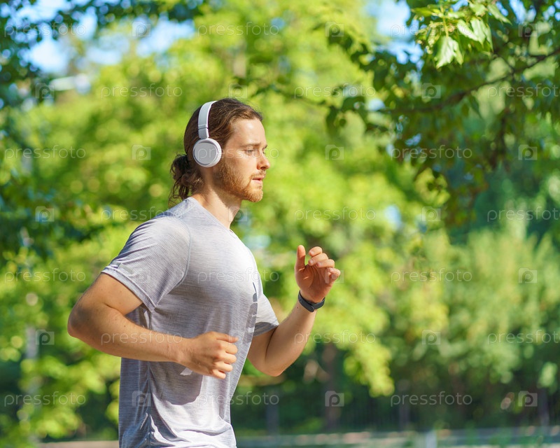 Сосредоточенный молодой спортсмен в наушниках бегает по зеленому парку и слушает любимую музыку, одетый в спортивную одежду. Вид сбоку на спортивного европейца, бегущего на природе