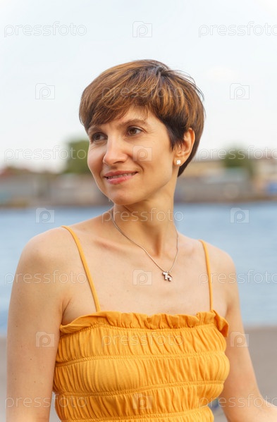 Портрет красивой зрелой женщины с короткими каштановыми волосами, стоящей на набережной реки в Санкт-Петербурге и смотрящей в сторону на сияющем солнце, наслаждающейся летним закатом. Копирование пространства, вертикальное
