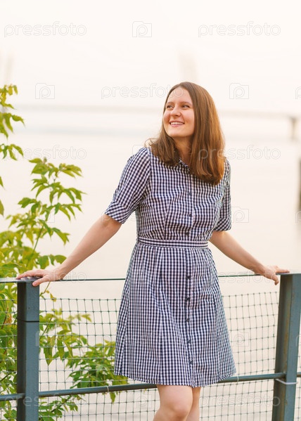 Полнометражный портрет красивой молодой женщины, смеющейся и отводящей взгляд, стоя на набережной у воды в городе, наслаждаясь летом и отдыхом