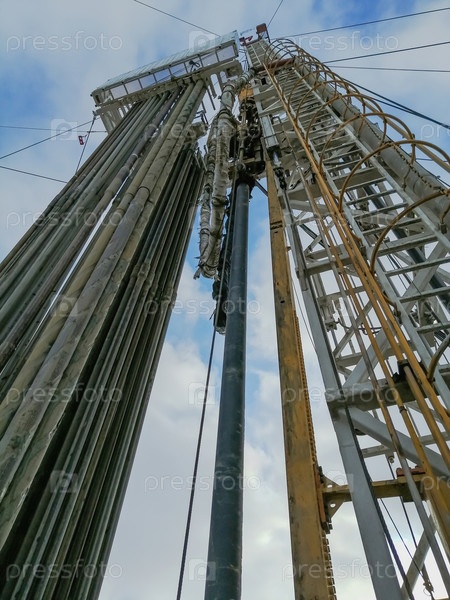 Буровая установка для бурения нефти и газа. Вид изнутри. Имеются буровые пробки для опускания в скважину. Агрегат оснащен верхним силовым приводом
