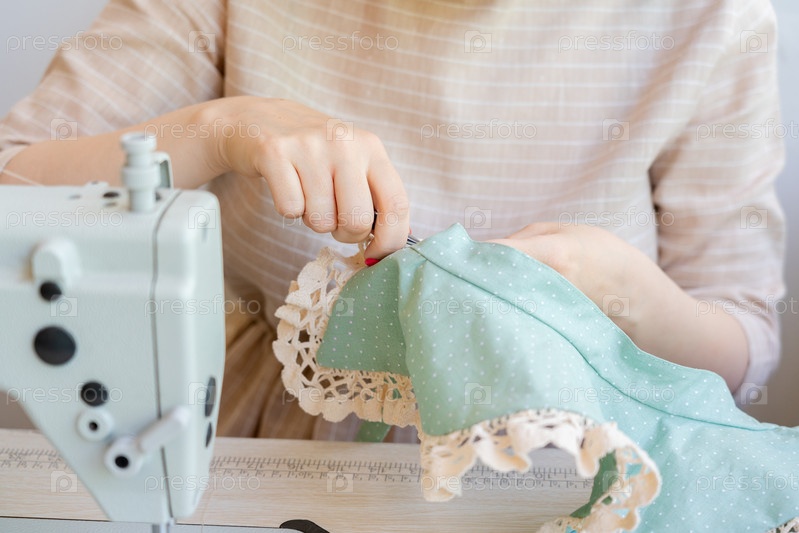 Профессиональная швея шьет винтажный кружевной воротник в ателье, обрезанный снимок. Женщина-модельер держит ткань и ножницы во время работы на рабочем месте со швейной машиной. Концепция творческого хобби