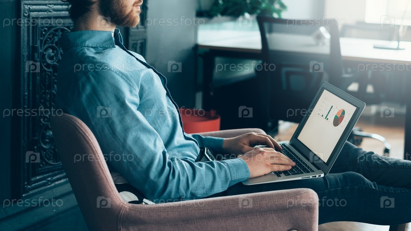 Вид сбоку на молодого безликого стриженого мужчину-трейдера в повседневной одежде, работающего на портативном компьютере, анализирующего финансовые данные, смотрящего на биржевые диаграммы и графики на экране, сидя в удобном кресле в офисе