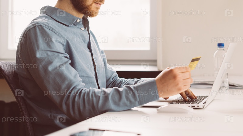 Безликий молодой человек сидит за столом в офисе с кредитной картой и делает покупки онлайн на ноутбуке, радостный покупатель-мужчина совершает оплату на компьютере онлайн, используя систему интернет-банкинга