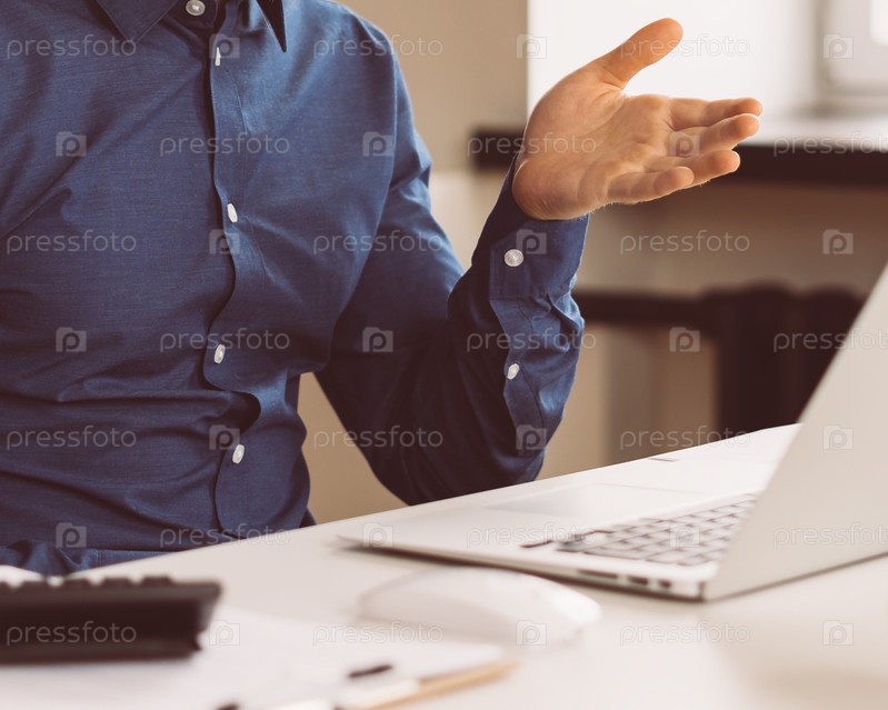 Обрезанный безликий мужчина, профессиональный оператор колл-центра, смотрит на экран ноутбука и разговаривает, сидя на рабочем месте в современном светлом офисе, мужчина-работник консультирует клиента онлайн