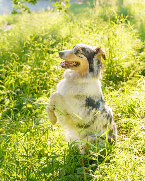Молодая очаровательная собака смешанной породы, стоящая на задних лапах в ожидании хозяина в зеленой траве в солнечный день, игривая австралийская овчарка сидит в позе попрошайничества с высунутым языком во время тренировки в поле