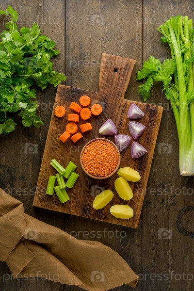 Набор нарезанных овощей на деревянной доске. Морковь, сельдерей, красный лук, картофель, чечевица, петрушка