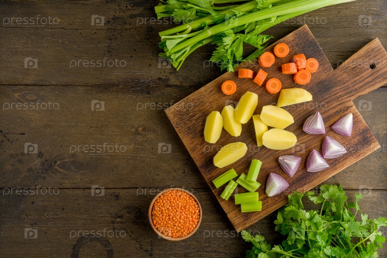 Горизонтальный веганский набор сырых овощей для супа на деревянной разделочной доске. Нарезанные морковь, картофель, чечевица, петрушка. Подготовка ингредиентов для приготовления. Нарезанные кубиками продукты. Копировать пространство