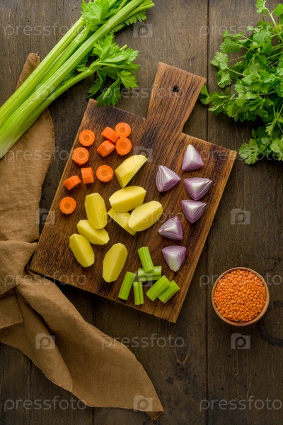 Вертикаль нарезанных овощей на деревянной доске. Морковь, сельдерей, красный лук, картофель, чечевица, петрушка