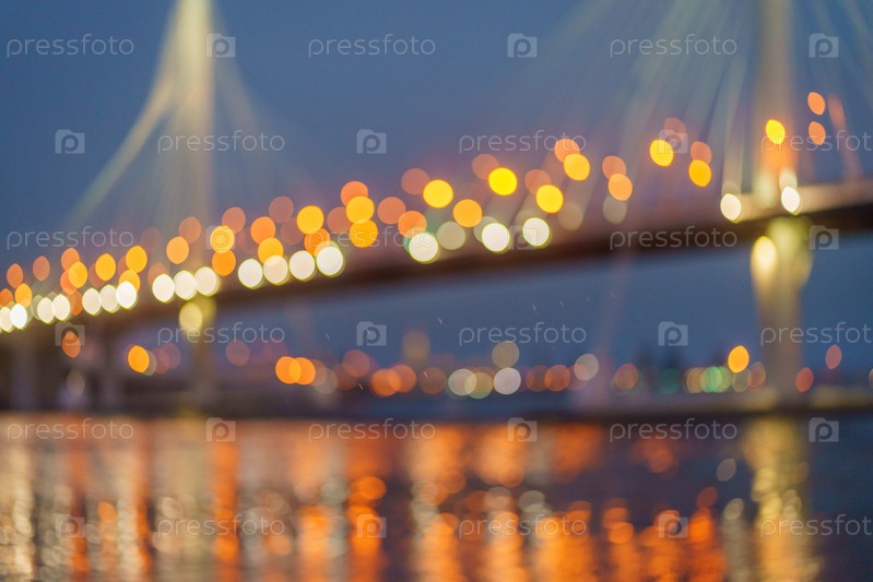 Мост в Санкт-Петербурге, абстрактный ночной фонарик боке на фоне города, размытие от фар. Сумерчное красочное отражение моста в речной воде, блики и размытые огни городского фона