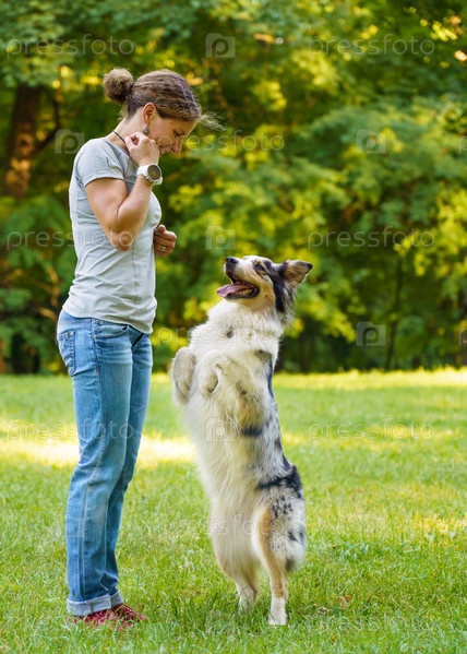 Вертикальный снимок дружелюбной 30-летней женщины, обучающей восхитительные команды умной собаки во время прогулки в парке в летний день, игривой австралийской овчарки, стоящей на задних лапах и смотрящей на хозяина во время тренировки послушания