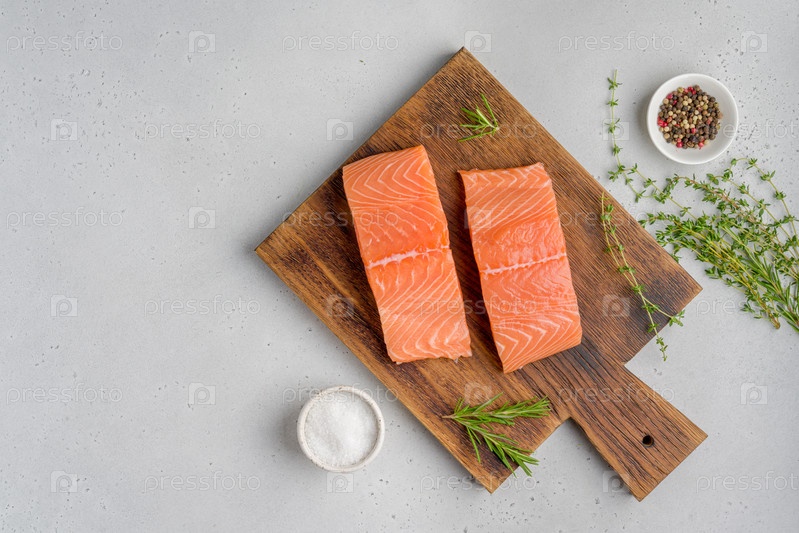 Свежее сырое филе скандинавского лосося. Розмарин и тимьян. Соль и перец. На старой деревянной доске. Пескетарианские морепродукты для приготовления. Приготовление питательной морской рыбы. Горизонтальное пространство для копирования