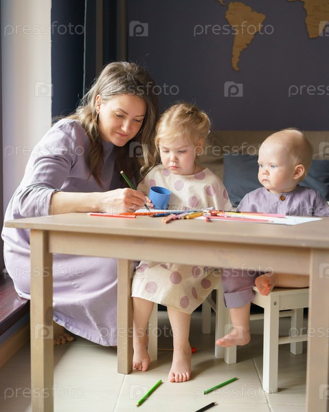 Заботливая молодая мама учит рисовать двоих своих маленьких детей