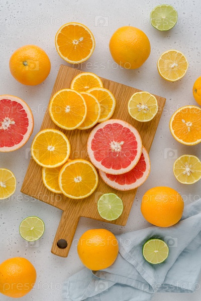 Красочные сочные летние апельсины, грейпфруты, лаймы, лимоны на деревянной доске