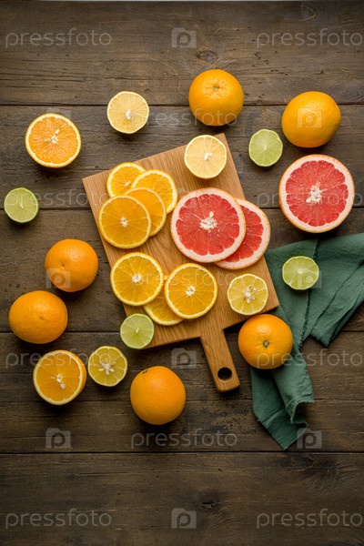 На борту свежие сочные витаминные апельсины, грейпфруты, лаймы, лимоны. Пищевой фон. Вертикальный вид сверху