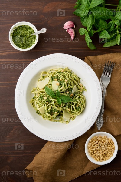 Традиционная итальянская паста песто с кедровыми орешками, чесноком, базиликом, сыром пармезан. Деревенская домашняя итальянская кухня. Вкусные вегетарианские зеленые макароны. Вид сверху вертикальный