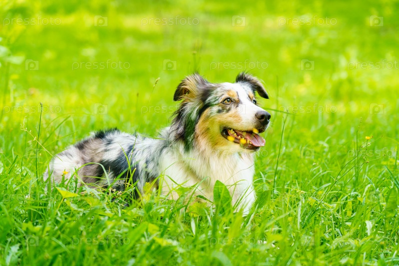 Расслабленная пятнистая коричневая, черно-белая австралийская овчарка с высунутым языком лежит в зеленой траве с желтыми цветами, счастливый домашний питомец в летний день на солнечном лугу