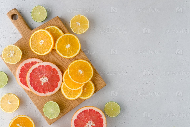 Красочные сочные летние апельсины, грейпфруты, лаймы, лимоны на деревянной доске. Горизонтальное пространство для копирования