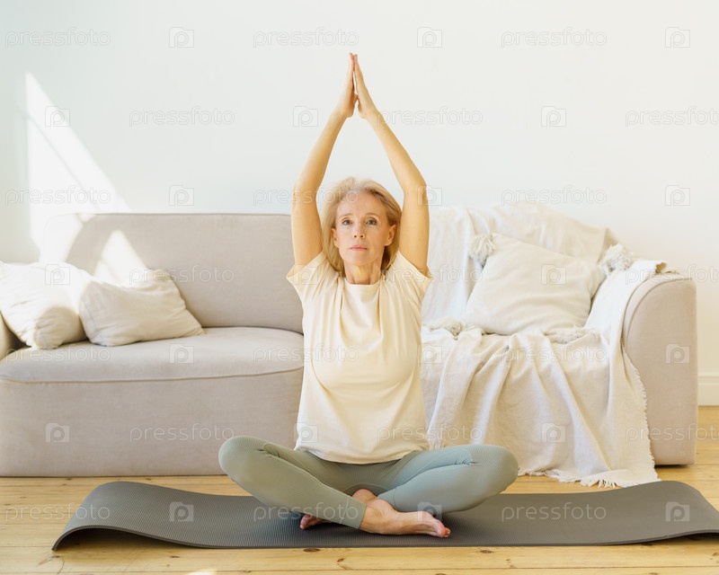 Пенсионерка в позе лотоса практикует упражнения йоги дома, сидя на коврике