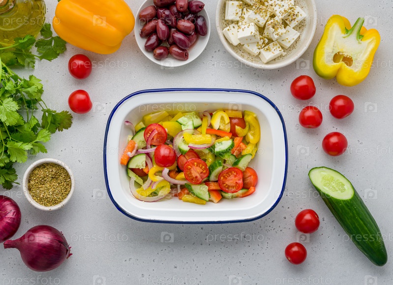 Процесс приготовления греческого деревенского салата хориатики. Стартер. Растительные ингредиенты. Нарезаем помидоры, перец, огурцы, лук. Масло экстра вирджин, приправы, петрушка, сыр фета, орегано