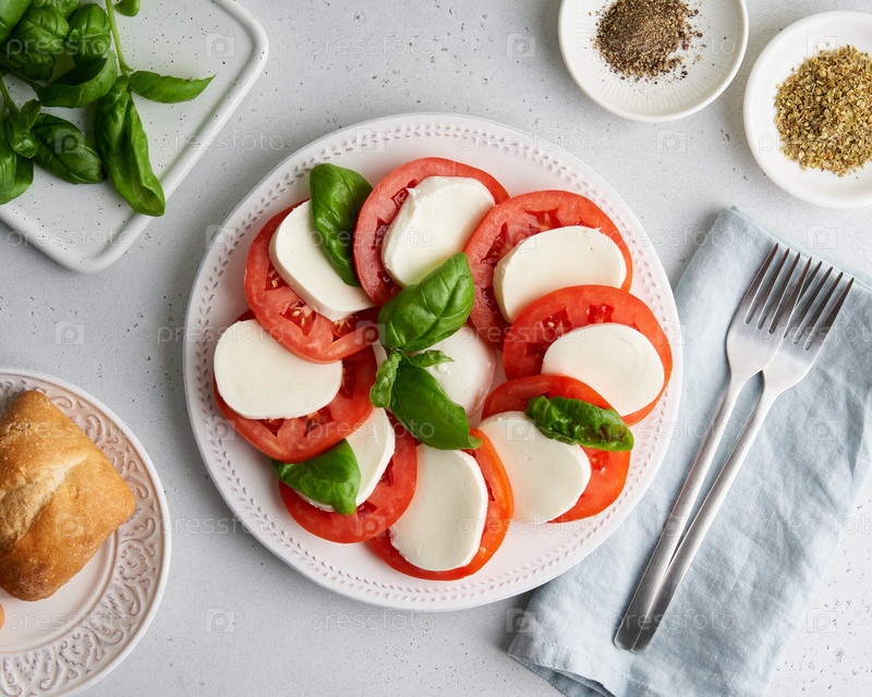 Классическая итальянская закуска капрезе с помидорами, моцареллой, базиликом, хлебом и орегано