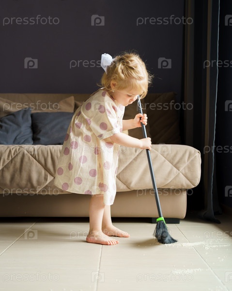 Очаровательная маленькая девочка с золотистыми волосами в льняном платье в горошек подметает пол метлой, помогает матери убирать комнату, снимок в полный рост. Маленький ребенок занимается домашними делами, проводя время дома