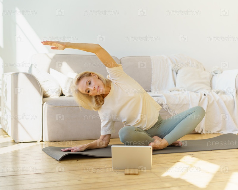Активная женщина-пенсионерка растягивает тело во время онлайн-занятий йогой дома, сидит в позе лотоса на коврике в гостиной и смотрит уроки спорта на цифровом планшете. Пожилые люди и спортивная концепция