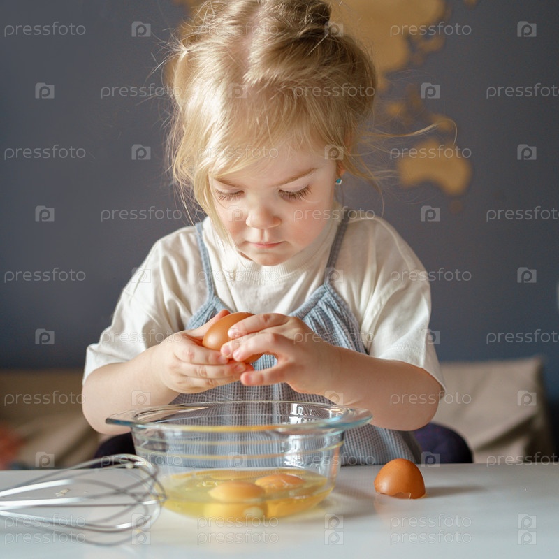 Сосредоточенная маленькая девочка со светлыми волосами разбивает свежие яйца в миску для омлета или пирога, стоя за кухонным столом, маленький ребенок учится готовить еду, проводя свободное время дома