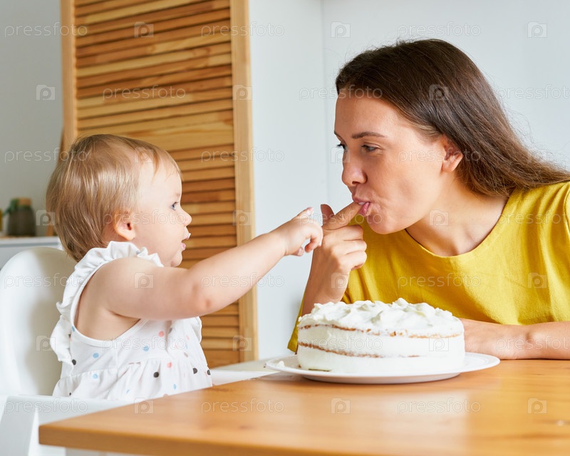 Девушка тычет пальцем в мать. Пробуем крем из торта. Мать улыбается и облизывает палец