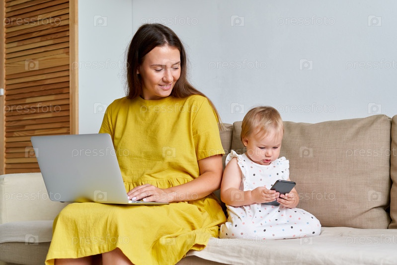 Мать работает дома на ноутбуке, а дочь выходит в сеть на смартфоне