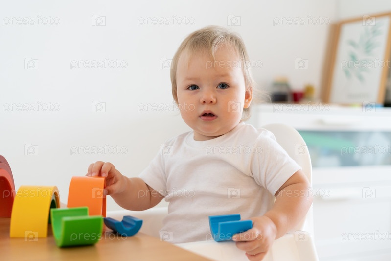 Голубоглазая блондинка играет с пластиковыми геометрическими фигурками. Развитие моторики ребенка в детском саду