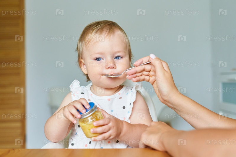 Ребенок сидит на стульчике, пока мама кормит малыша дома