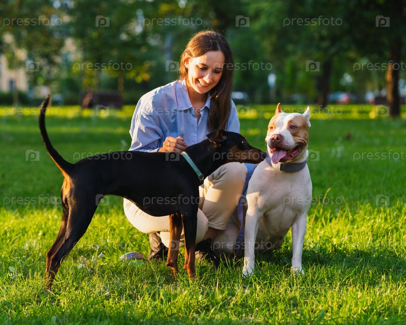 Брюнетка улыбается и сидит с любопытным американским питбулем в парке. Собака встречает другую собаку на рассвете