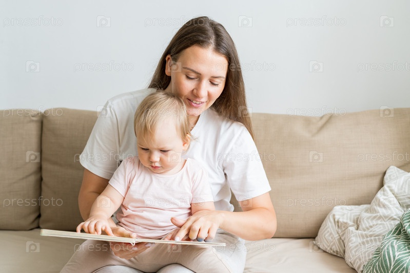 Любопытная девочка сидит на коленях матери и читает книгу с картинками. Улыбающаяся мама. Копировать пространство