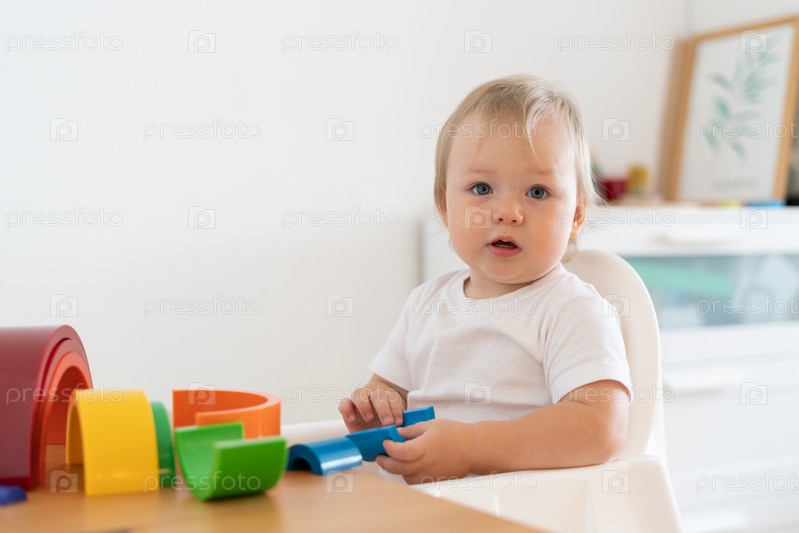 Блондинка любопытный ребенок играет с геометрическими деревянными фигурками. Концепция обучения ребенка дома