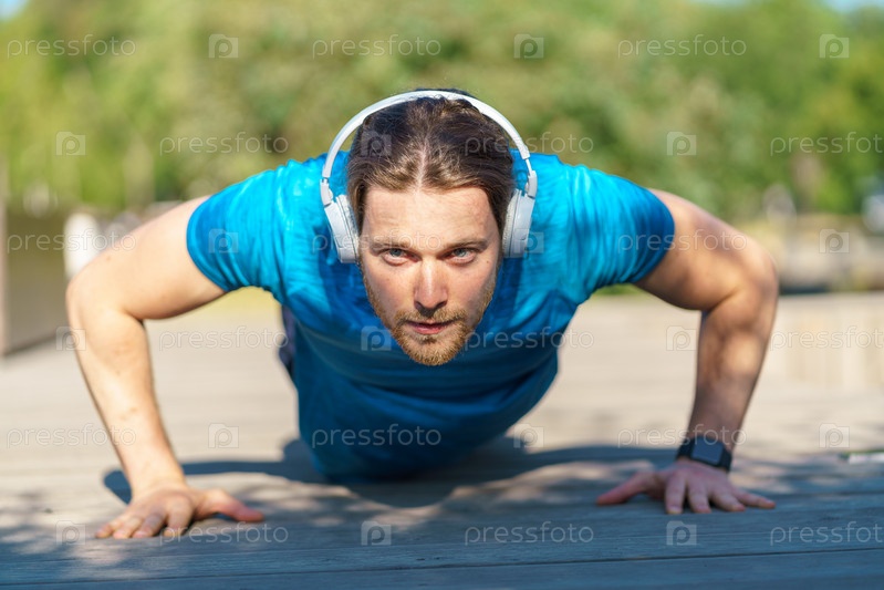 Вид спереди молодого сильного спортивного мужчины в наушниках и спортивной одежде, делающего отжимания на земле во время спортивных тренировок на открытом воздухе в жаркий летний день, сосредоточенный спортсмен-мужчина, тренирующийся в парке