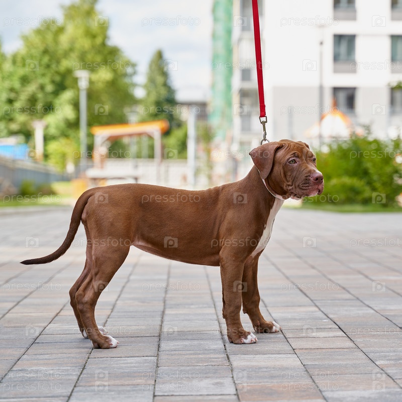 Коричневый молодой американский питбультерьер на поводке стоит на асфальте и смотрит в сторону от камеры. Жилой дом на заднем плане. Послушный щенок на прогулке с анонимным хозяином. Копировать пространство
