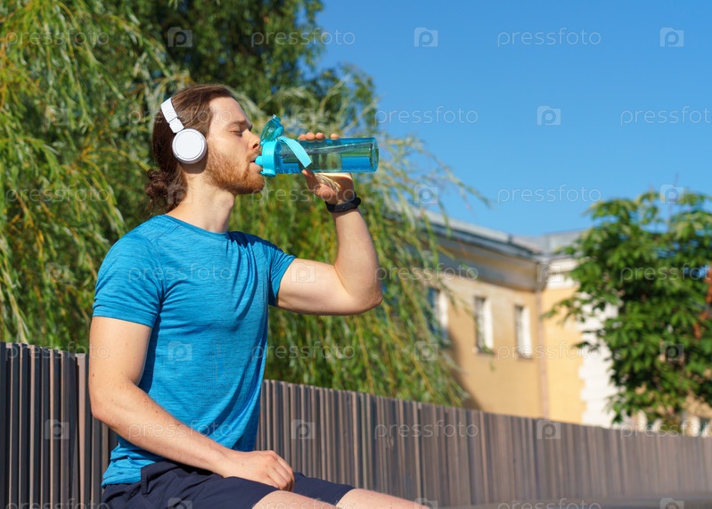 Жаждущий молодой спортсмен в синей рубашке пьет пресную воду из бутылки, стоя на улице на фоне зеленых деревьев, активный мужчина в наушниках делает перерыв. Водный баланс во время тренировки