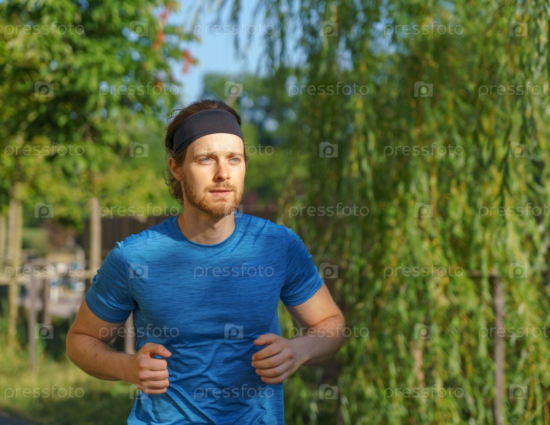 Оставаться в форме и быть здоровым. Спортивный европейский мужчина в спортивной одежде в полный рост наслаждается утренней пробежкой на свежем воздухе, бегает по дороге в зеленом парке в прекрасный летний день. Концепция спорта и физической активности