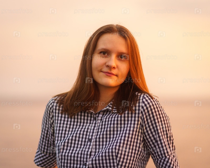 Поясной портрет красивой молодой женщины, смотрящей в камеру на фоне заката и красного солнечного света над океаном или морем. Дружелюбная, привлекательная блондинка с длинными волосами в свете заката летом