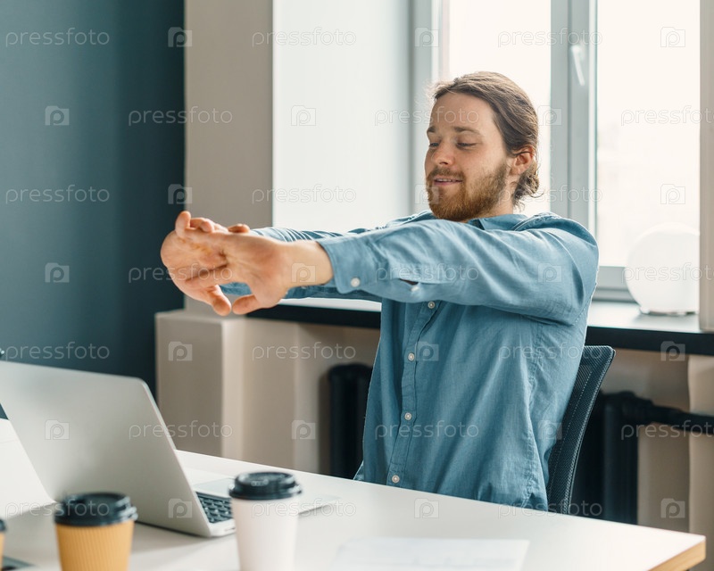 Молодой расслабленный офисный работник в повседневной одежде вытягивает руки после долгой работы на ноутбуке и смотрит на экран компьютера с улыбкой, сотрудник-мужчина отдыхает, расслабляясь в офисе во время рабочего дня