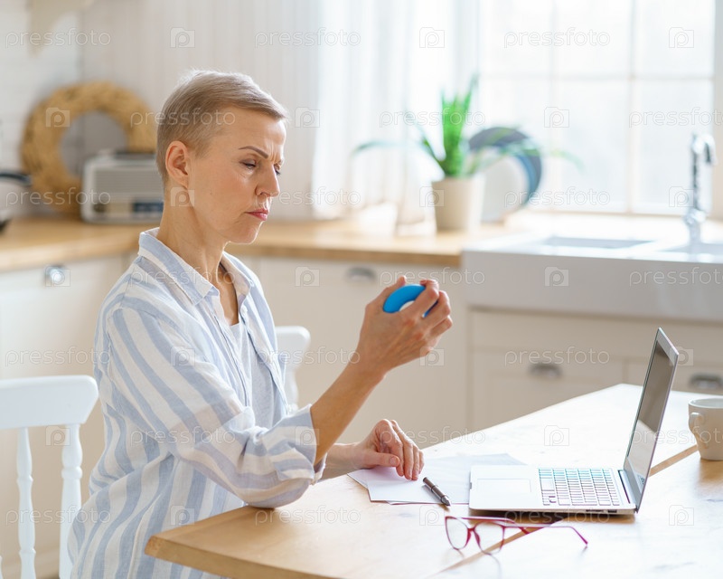 Сосредоточенная зрелая женщина тренируется с резиновым круглым кольцом для ладоней во время работы или учебы на ноутбуке, профилактика туннельного синдрома и разминка рук. Концепция старших людей и технологий