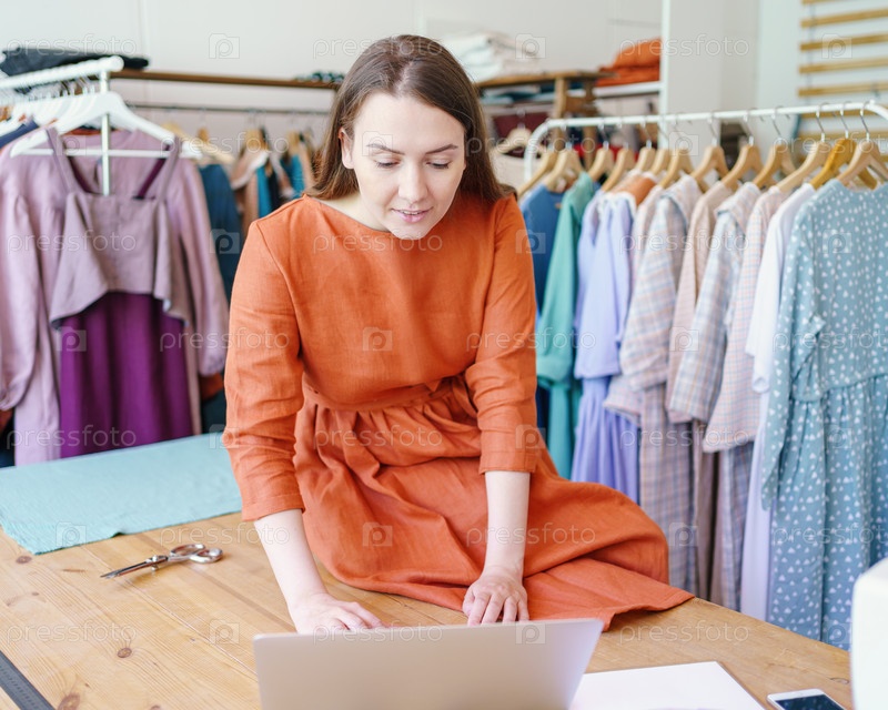 Работаем над новой коллекцией. Молодая успешная деловая женщина-модельер сидит за столом и работает на ноутбуке в собственной мастерской, портниха или швея создает дизайн одежды онлайн