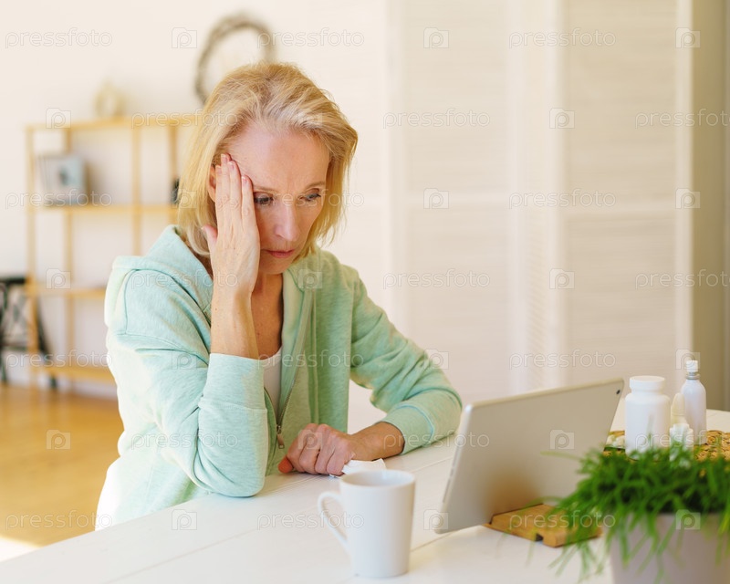 Современная целеустремленная женщина средних лет онлайн-звонит врачу на ноутбуке и рассказывает о мигрени, головной боли и головокружении. Женщина трогает голову, сидит дома на кухне. Концепция здравоохранения и медицины