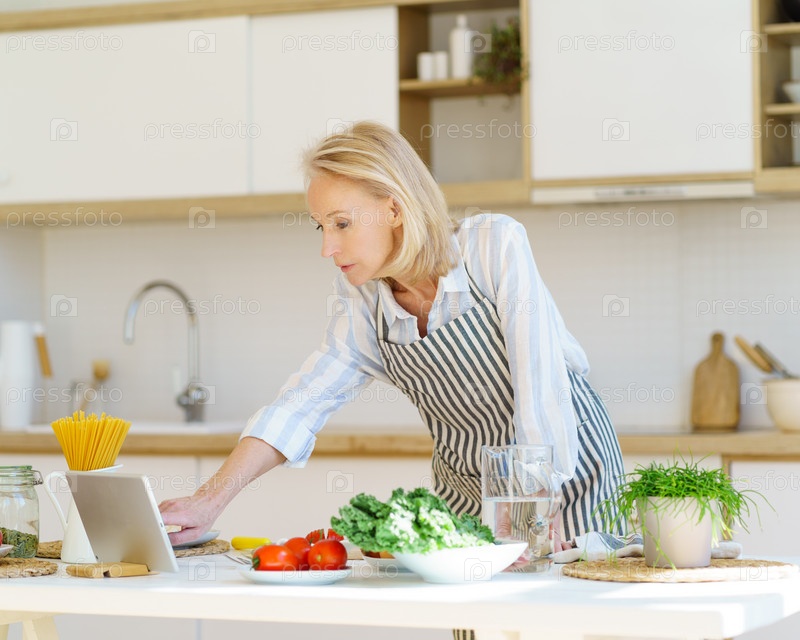 Пожилая женщина смотрит видео-рецепт на цифровом планшете, готовя на пенсии дома