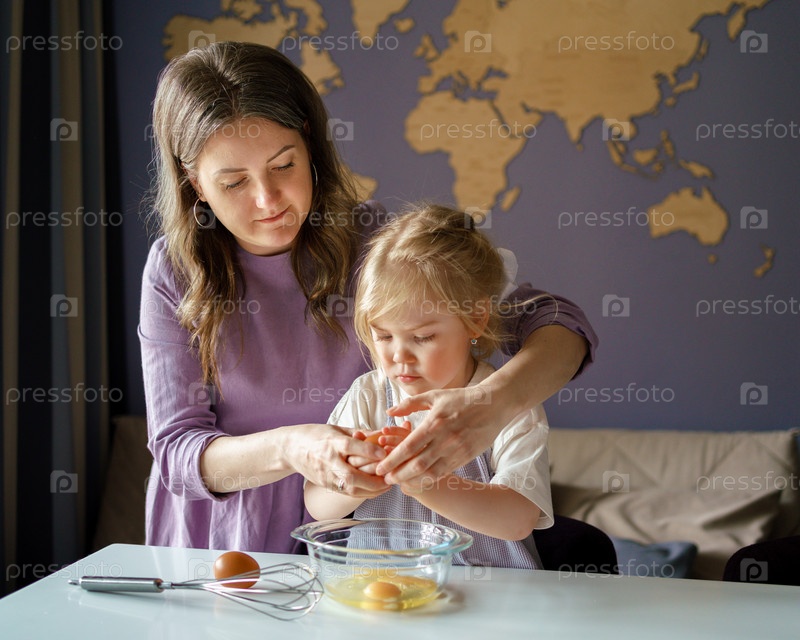 Вовлечение детей в процесс приготовления пищи. Молодая мама показывает милой маленькой дочке, как разбивать свежие яйца в миску для пирога или омлета, пока вместе готовим еду дома. Мать учит ребенка готовить