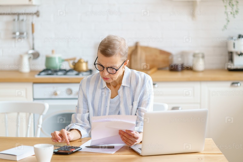Сосредоточенная пожилая женщина в очках работает с документами, проверяет платежи, рассчитывает на калькуляторе