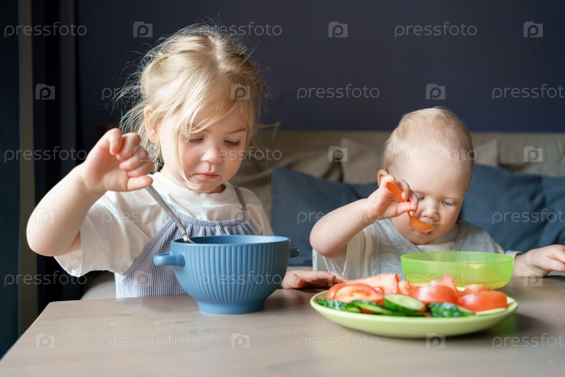 Двое маленьких милых детей, старшая сестра и маленький брат, едят здоровый обед, едят суп и свежие овощи, огурцы, помидоры, сидя дома за деревянным столом и наслаждаясь вегетарианской едой